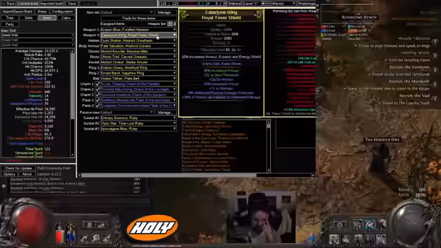 02:41:28Der Streamer analysiert zunächst einen Build eines Rang 1 HCSSF Warbringers, der mit Shieldwall, Resonating Shield, Seismic Halt, Magma, Fortifying Cry, Time of Need, Scavenged Essence Bursack und Leapslam spielt. Er wundert sich, wie der Spieler ohne Second Wind und trotz geringem Spirit-Wert seine Fähigkeiten aufrechterhalten kann. Es wird festgestellt, dass der Build stark auf Armor setzt. Der Streamer importiert den Build in Path of Building (POB), um ihn genauer zu untersuchen. Dabei stellt er fest, dass der Tree komplett anders ist als erwartet. Er entdeckt, dass der Damage von Shield Wall sehr hoch sein soll und man damit Bosse one-shotten kann. Er exportiert seinen eigenen Build in POB und stellt fest, dass er 33 Spirit hat, was ausreicht, um alle vier Buffs ohne Vitality laufen zu lassen. Es wird diskutiert, wie der Top-Spieler seine Auren verwaltet und welche Rolle Waffensets dabei spielen könnten. Der Streamer überlegt, seinen eigenen Charakter umzuskillen, um den Build zu testen, hat aber Bedenken, da er nicht genügend Support-Gems besitzt.