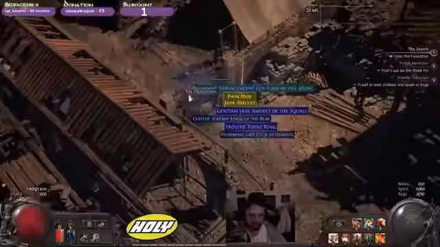 01:14:09Der Streamer kämpft gegen einen Endboss, dessen Aktionen schwer zu erkennen sind. Er kommentiert, dass sein Schaden zwar hoch erscheint, aber möglicherweise nicht ausreicht. Er erreicht Number of Trials 4, was noch nicht ausreichend ist. Der Streamer schließt Akt 4 ab und freut sich über den Erfolg. Er kommentiert, dass die nächsten Gebiete keine Story mehr beinhalten. Es wird überlegt, welche der drei Sidequests zuerst gemacht werden sollen. Der Streamer findet einen potenziell guten Ring und bewertet dessen Eigenschaften, insbesondere Attack Speed und Stärke. Er überlegt, was er als Gem auf seine Waffe machen soll und sucht nach Inspiration bei Pioin Ninja Builds. Er stellt fest, dass ein anderer Spieler Skillspeed verwendet, was er selbst nicht hat, und entscheidet sich stattdessen für Stärke.