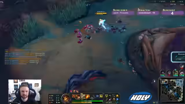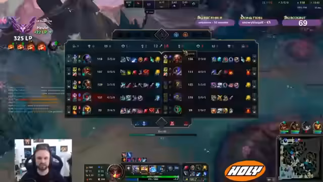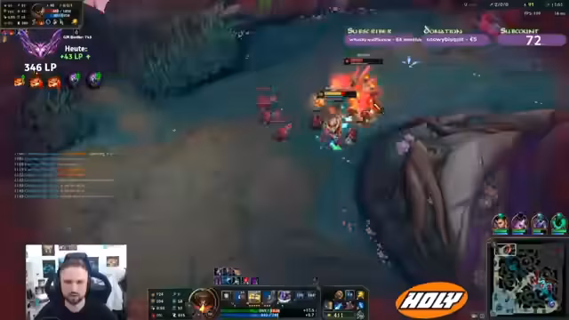 03:22:50Das Gameplay von League of Legends bleibt im Mittelpunkt. Ein Kollabieren mit dem Mid-Laner führt zu Verwirrung. Im Spiel selbst gibt es viele unnötige Kämpfe. Der Streamer kritisiert nach einem Kampf am Drachen, dass sein Team trotz Überzahl nicht in der Lage war, die Gegner zu eliminieren. Die eigenen Plays werden als zu unkoordiniert und zufällig beschrieben, was das Carryen erschwert, besonders wenn die Botlane zurückhaltend agiert.
