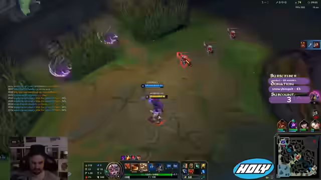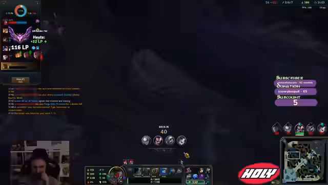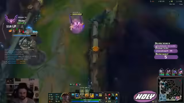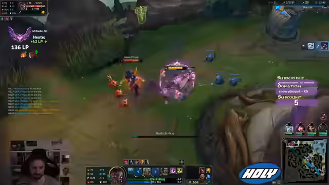 00:06:47Nach den technischen Problemen beginnt der SoloQ-Part des Streams. Kev1n spielt den Champion K'Sante und offenbart ein wichtiges Gameplay-Erkenntnis: Statt des klassischen Sheen-Builds ist ein frühes Chain Vest-Item aufgrund der Fähigkeitsskalierung und der Tankiness schädlicher und effektiver. Trotz einer guten 1v1-Phase im Top-Lane gegen einen Kled verliert er aufgrund von Gank- und Timing-Problemen, insbesondere durch den Jungle-Eingriff der gegnerischen Evelyn, das Spiel.