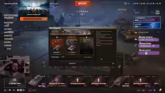 04:02:32Nachdem er eine ungeliebte Map ausgeschaltet hat, wechselt der Streamer den Panzer und holt den Tigermaus raus. 'Es ist Zeit für die Tigermaus. Oh fuck.' Er überlegt, ob Clanmitglieder wie Libra oder Mika ihm zuschauen oder joinen könnten, und erwähnt technische Probleme bei der Verbindung. Er spricht über seinen 游戏account, der Legend-Status erreicht hat, und lädt die Zuschauer ein, ebenfalls teilzunehmen.
