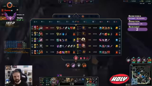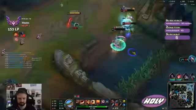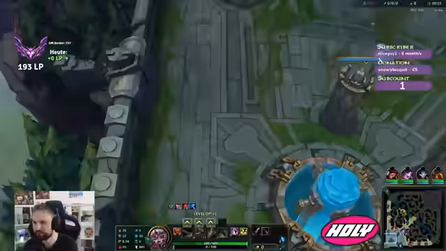 00:06:03Der Hauptfokus des Streams richtet sich auf League of Legends, insbesondere auf das SoloQ-Gameplay. Der Streamer spielt Toplane und wählt Champion wie Garen und Renekton. Er beschreibt detailliert seine Erfahrungen mit den Matchups, die Item-Strategien wie Triforce und Sterak's Gage, und seine Entscheidungen bezüglich Runen wie PTA statt Conqueror. Er analysiert seine Fehler, wie z.B. einen zu hastigen Start, und denkt laut über Verbesserungen und alternative Champions nach. Die Spiele sind oft von Frustration geprägt, wenn die Teammates nicht kooperieren oder das Spiel aus den Rudern läuft.