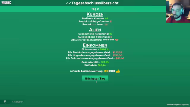 02:16:43Das Spiel 'Roadside Research' beginnt, in dem Aliens eine Tankstelle betreiben und versuchen, menschliches Verhalten zu imitieren, um Geld zu verdienen. Es wird humorvoll über die Motivation der Menschen gesprochen, insbesondere über Geld und Geschlechtsteile. Der Streamer und sein Mitspieler schlüpfen in die Rolle von Alien-Tankstellenbetreibern und erkunden die Spielmechaniken, wie das Scannen von Produkten und den Kauf von Artikeln wie Schwarztee und Müsli. Es werden skurrile Details entdeckt, wie ein Foto von Fälzer mit einer Dose Makrelen und ein Schuhschwamm, der zum Reinigen von Autos verwendet wird. Sie versuchen, die Preise festzulegen und ein Schild aufzustellen, während sie humorvolle Kommentare abgeben. Es wird ein Anruf von Mr. Brown erwähnt, um ein kaputtes Regal zu reparieren. Die Aliens interagieren mit Kunden, tanken ihre Fahrzeuge und nehmen Zahlungen entgegen, wobei sie versuchen, menschlich zu wirken. Kunden loben den Service und das gepflegte Aussehen der Verkäufer.