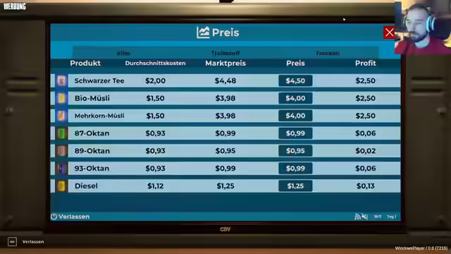 03:03:45Ein Kunde wird wütend und hinterlässt Unrat im Laden, was zu sinkenden Bewertungen führt. Es wird festgestellt, dass der Kunde wütend ist, weil er nicht in Ruhe gelassen wird, was zu weiteren Problemen führt. Es wird über die Preise von Produkten diskutiert, wobei festgestellt wird, dass das Porridge auf dem globalen Markt teurer ist als im Laden. Ein nackter Kunde wird entdeckt, und es wird festgestellt, dass der Boden mit einem merkwürdigen Film bedeckt ist. Es werden Versuche unternommen, die Tarnung des Ladens zu verbessern, indem Flaggen aufgehängt werden. Die positiven Bewertungen gehen zurück, obwohl die Preise nicht zu hoch sind. Es wird über die Möglichkeit diskutiert, eine Fußmatte oder einen Wasserspender aufzustellen, um die Kundenzufriedenheit zu erhöhen. Ein Kunde raucht an der Zapfsäule, und die Sternebewertungen sinken weiter. Die Preise werden erneut reduziert, was jedoch nicht sofort zu einer Verbesserung der Bewertungen führt. Es wird vermutet, dass das Fotografieren der Kunden diese wütend macht. Der Eingangsbereich des Ladens ist erneut verschmutzt, was zu weiteren Minuspunkten führt. Es wird über den Spritverbrauch gesprochen, und es werden neue Produkte benötigt. Ein Spieler baut einen 'Blindmacher' zusammen, während ein anderer in einer 'Säuremine' arbeitet. Es wird über die hohe Konzentration von DNA im Laden gesprochen, und ein Spieler hat Schwierigkeiten, Gegenstände aufzuheben. Es wird versucht, das Problem durch Rejoining zu beheben. Die Toiletten im Laden häufen sich immer mehr.