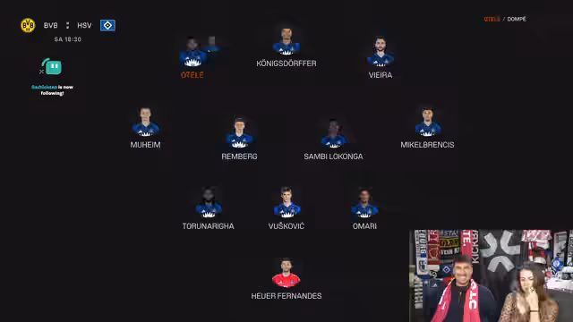 01:01:11Ein weiterer Gast, Dennis, stellt sich im Stream vor. Es werden weitere Spielerduelle und Entscheidungen besprochen, zum Beispiel Damen gegen Zetterer im Tor und Suzuki statt Sinani. Der Ton bleibt locker und humorvoll. Auch der Besuch von Eskar aus Heidenheim wird erwähnt und weitere Empfehlungen wie Vieira, Burkhard oder Becker werden gegeben. Der Fokus liegt auf klaren, spielerischen Entscheidungen für die Fantasy-Liga.