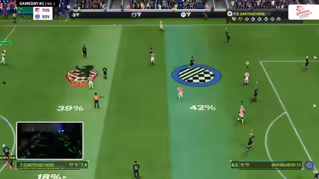01:42:23Der Stream geht in die dritte Spielrunde und der Kommentator erklärt, aufgrund der vielen Perspektiven im Setup, die es ihm erschweren, ständig den Chat oder die Kamera zu beachten. In der ersten Partie treffen Struck und Fortuna Köln aufeinander. Nach anfänglichen Torchancen gelingt es Fortuna Köln, eine Führung von 2:1 herauszuspielen. Struck zeigt jedoch einen starken Willen und erzielt kurz vor der Pause den Ausgleich zum 2:2. Das Spiel bleibt bis zur Halbzeit eng und ausgeglichen.