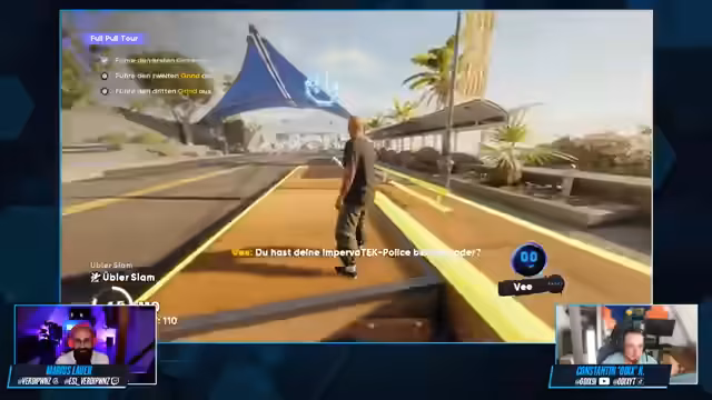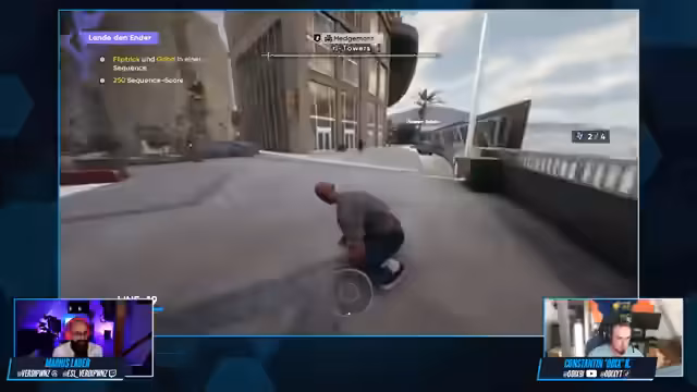00:23:53Nach der Charaktererstellung und der Wahl der klassischen Steuerung beginnt das Tutorial. Marius empfindet das anfängliche Sichtfeld (FOV) als zu groß und passt es auf 90 an. Das Tutorial wird als sehr leicht verständlich und linear aufgebaut beschrieben, was einen schnellen Einstieg ermöglicht und nicht unnötig ausbremst. Konstantin stimmt zu, dass es super angenehm ist und man kaum Fehler machen kann. Die Grafik wird als cool und nicht überladen empfunden, wobei Marius eine Ähnlichkeit zu Need for Speed feststellt. Die Steuerung der Tricks, die durch Gesten ausgeführt werden, erinnert an Beat-em-up-Spiele und wird positiv hervorgehoben. Auch die Musikauswahl mit Hip-Hop- und Punkrock-Tracks wie Bad Religion findet großen Anklang. Ein weiteres positives Element ist die Möglichkeit, sich nach einem Sturz einfach zu resetten und an einem gesetzten Marker neu zu starten. Das Tutorial führt durch verschiedene Tricks wie Kickflips und Heelflips, die als intuitiv empfunden werden. Die Steuerung erhält eine vorläufige Bewertung von 8,5 von 10 Punkten. Nach Abschluss der grundlegenden Tricks geht es mit dem Wassertaxi in die Stadt, um weitere Missionen zu starten.
