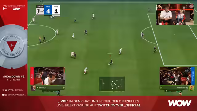 01:54:40Der erste Showdown-Spiel zwischen St. Pauli und Freiburg beginnt als hochdynamisches und torreiches Duell zwischen den zwei besten Einzelspielern der Saison, Nasada und Berkay Laien. Nasada zeigt starke Offensivqualitäten und führt seine Mannschaft mit mehreren Toren zum klaren Sieg. Parallel dazu startet der VfB Stuttgart gegen den HSV mit einer beeindruckenden Dominanz und führt zur Halbzeit mit 6:0. Spieler wie Dullenmaik und Usun sind offensiv extrem stark und agieren souverän.