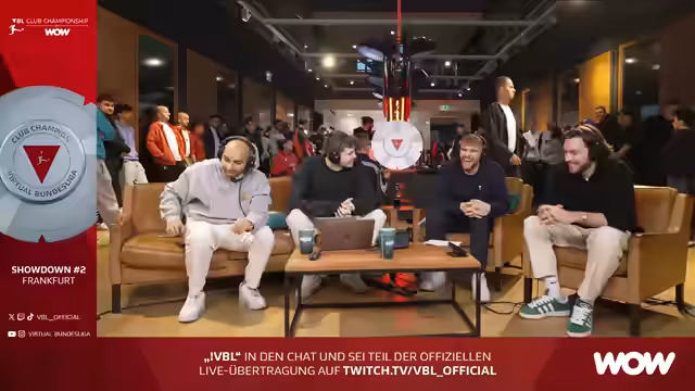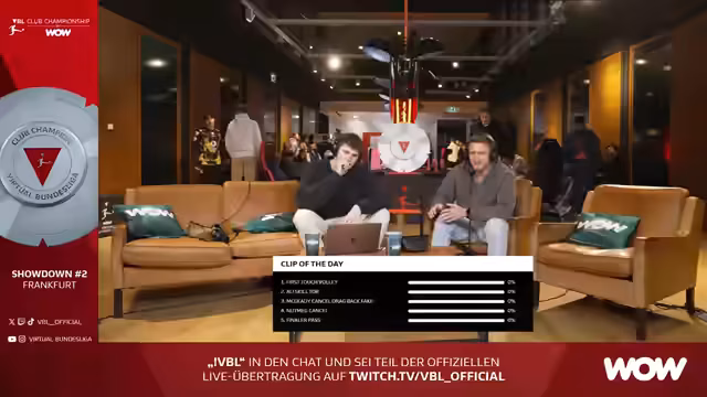 00:11:02Der VBL Club Championship Showdown #2 wird von Tim Lalilatka präsentiert, der die Zuschauer aus Frankfurt begrüßt. Neben ihm sitzen die Gäste Mo Auber und Keanu. Der Stream ist ein Gemeinschaftsprojekt, bei dem parallel auch in den Kanälen der Streamer gesendet wird. Manuelle Checks laufen, um die technische Funktion der Übertragung und des gemeinsamen Chats sicherzustellen, und die Vorfreude auf das Event ist hoch.