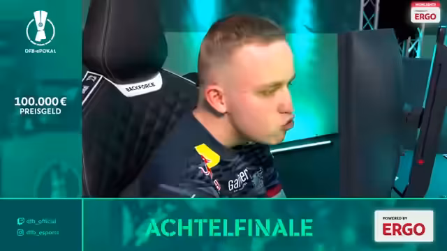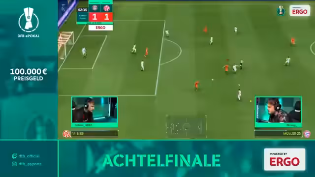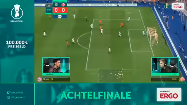 00:06:04Der DFB-E-Pokal powered by ERGO beginnt mit dem Achtelfinale, bei dem es um den Einzug ins Finalevent in Frankfurt mit einem Preisgeld von bis zu 100.000 Euro geht. Nach der Begrüßung wird bekannt gegeben, dass Pizzo krank ist und durch Mögo ersetzt wird. Das erste Duell ist ein Kracher-Match zwischen den Divisionsmeistern FC Bayern und Mainz 05, bei dem die Stars Koray (Bayern) und Didmir (Mainz) im Fokus stehen.