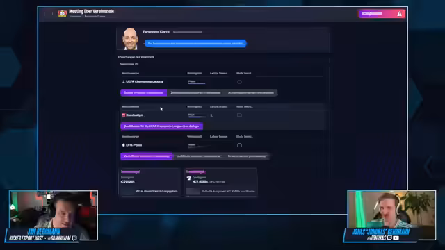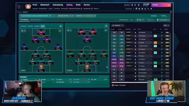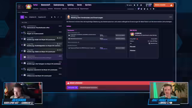 00:11:12Der Stream beginnt im Spiel am 11. August 2025, wobei Fernando Caro die Spieler willkommen heißt. Das Ziel ist es, die Vorbereitung zu durchlaufen, Stärken und Schwächen der Handhabung zu erkennen und idealerweise den Pokal sowie den ersten Spieltag zu absolvieren. Zunächst wird das Gehalt von wöchentlich auf jährlich umgestellt, um eine bessere Übersicht zu erhalten. Anschließend werden die ersten E-Mails durchgegangen, darunter die Begrüßung durch Fernando Caro und die Vorstellung der Vereinsgeschichte, die den ersten Bundesliga-Titel von Leverkusen im FM24 hervorhebt. Es werden die Fantypen von Leverkusen vorgestellt, die unterhaltsamen Fußball sehen, vor dem 1. FC Köln landen und das Verfolgerfeld anführen wollen. Die exzellenten Trainings- und Jugendeinrichtungen des Vereins werden ebenfalls erwähnt, wobei auf aktuelle politische Diskussionen um den Campus in Monheim hingewiesen wird. Die Vereinsziele umfassen Wettbewerbsfähigkeit in der Champions League, Einhaltung des Gehaltsbudgets und die Entwicklung junger Spieler mit Gewinn. Diese Ziele spiegeln die reale Philosophie von Simon Rolfes wider. Der Kader wird vorgestellt, darunter wichtige Personalien wie Robert Andrich und Alejandro Grimaldo. Auch das Transferfenster und die Kaderregeln werden kurz beleuchtet.