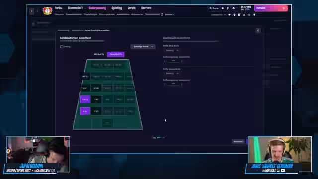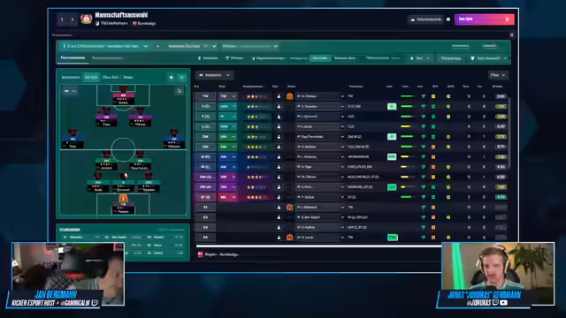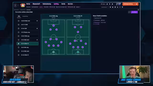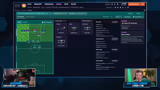 00:21:39Nach der Kaderanalyse widmet sich der Stream der Taktik. Das Taktikfenster hat sich optisch stark verändert, behält aber die grundlegenden Funktionen des FM24 bei. Der Spieler kann nun überlegen, welche Spielweise er bevorzugt, wobei die Daumen nach oben die vom Co-Trainer als geeignet angesehenen Taktiken anzeigen. Es wird diskutiert, ob Tiki-Taka oder vertikales Tiki-Taka für Leverkusen geeignet ist, wobei letzteres aufgrund der engeren Verschiebebewegungen und der besseren Restfeldsicherung gewählt wird. Eine neue Funktion ermöglicht es, die Formation mit und ohne Ball separat anzupassen, was eine detailliertere Reaktion auf den Gegner erlaubt. Es wird eine Dreierkette (3-4-3) für den Ballbesitz gewählt, die an die Spielweise von Xabi Alonso angelehnt ist, und eine Fünferkette defensiv ohne Ball. Die Möglichkeit, Spielerrollen individuell anzupassen, wie Grimaldo als Spielmacher auf die Sechs zu ziehen oder einen Zehner breiter aufzustellen, wird als sehr kreativ und flexibel empfunden. Die visuellen Hilfen im Taktik-Visualizer, die anzeigen, wie sich die Mannschaft in verschiedenen Ballbesitzzonen aufstellt, werden als Killer-Feature und große Hilfe für neue Spieler gelobt. Auch Team-Anweisungen wie Passspieltempo und Umschaltverhalten können detailliert eingestellt werden, wobei der Visualizer sofort die Auswirkungen zeigt.