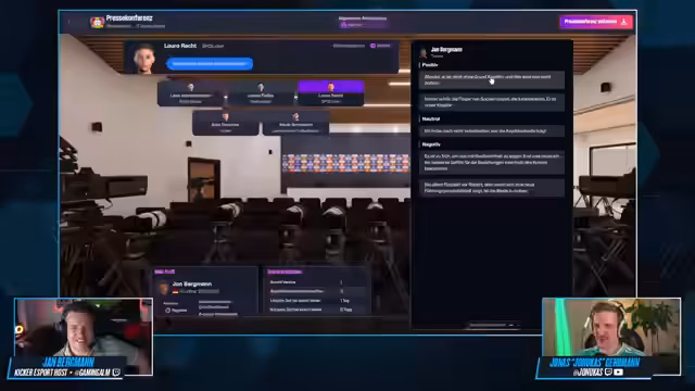 00:46:46Die Möglichkeit, Mannschaftsprämien anzupassen, um Transferbudget freizuschaufeln, wird als interessante Option für finanziell schwächere Vereine hervorgehoben. Im vorliegenden Fall wird jedoch davon ausgegangen, dass der Verein gut situiert ist und der Kader trotz allem Potenzial hat, wenn die Ansprüche nicht zu hoch sind. Die Teilnahme an der Pressekonferenz wird als sinnvoller Schritt erachtet, um die Interaktionsmöglichkeiten zu erkunden. Es zeigt sich, dass hier mehr Optionen zur Verfügung stehen als bei der Kaderansprache, darunter die Möglichkeit, Fragen zu beantworten, Kommentare abzugeben oder sogar die Pressekonferenz zu verlassen. Die Antworten auf die Fragen der Journalisten reichen von klaren Statements über die Freude am neuen Job bis hin zu Ausweichmanövern bei kritischen Fragen. Die Länge und der Detailgrad der Pressekonferenzen werden als realistisch, aber auch als zeitaufwendig empfunden, weshalb die Delegation dieser Aufgabe an Mitarbeiter in der Realität bevorzugt würde. Die erste Pressekonferenz wird schließlich beendet, um den Spielfortschritt nicht unnötig zu verzögern.