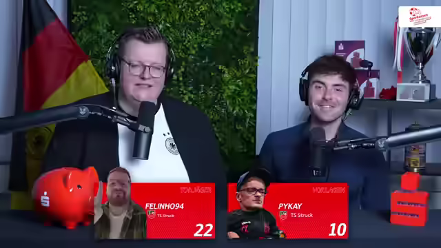 01:03:30Die Relevanz von Pro-Clubs bei Profifußballern wird diskutiert. Vor fünf Jahren gab es ein Showmatch zwischen einer Pro-Clubs-Truppe und einem Mix aus Profifußballern, Mitarbeitern des SC Paderborn und E-Footballern. Einige Lizenzspieler verbringen ihre Freizeit an der Konsole. Ein Aufruf an Profis, sich zu melden, wenn sie Pro-Clubs spielen wollen. Union Felbert spielt gegen den TS Struck. Sascha Mockenhaut von SVW Wiesbaden spielt seine Position auch im Pro-Clubs-Modus und nahm am Final Four der Pro League Championship teil. Lukas Klostermann war bei Leipzig in Pro-Clubs-Turnieren aktiv. Ein Abschluss von Struck wird vom Torhüter verhindert. Felbert muss sich erst finden, um einen Angriff zu starten. Die Fans von Bord, Felbert und Struck werden erwähnt. Struck geht mit 1:0 in Führung durch Sunny. Ein Ballverlust von Felbert wird von Struck ausgenutzt. Thies Struck feiert mit einem Trinkspruch. Struck führt 5:1, Sunny erzielt das 2:0. Ein Ergebnisdienst meldet eine Führung für Fühlingen-Chorweiler gegen Union Solingen. Paderborn gewinnt auswärts gegen Braunschweig und Nürnberg gewinnt mit Miro Klose auf der Bank. Eine rote Karte für Union gegen Fühlingen führt zu einem Freistoß und einem Tor für Fühlingen. Ein komfortabler Vorsprung und eine rote Karte für Solingen erschweren die Situation.