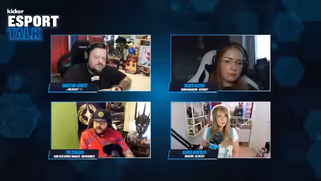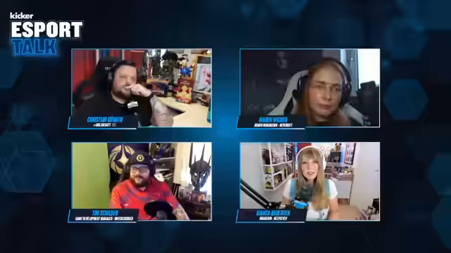 00:04:46Der Kicker eSport Talk startet mit dem Thema Trading Card Games (TCGs). Moderator Christian Grün begrüßt die Gäste Maren (Brandmanagerin bei NeverRift), Tim (Entwickler bei Disney Locana für Ravensburger) und Bianca (Inhaberin eines TCG-Stores aus Lübeck). Zuerst stellen sich die Gäste kurz vor und erzählen von ihrem Werdegang im TCG-Bereich, der oft mit Kindheitserfahrungen mit Titeln wie Magic, Pokémon und Yu-Gi-Oh! begann.
