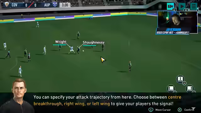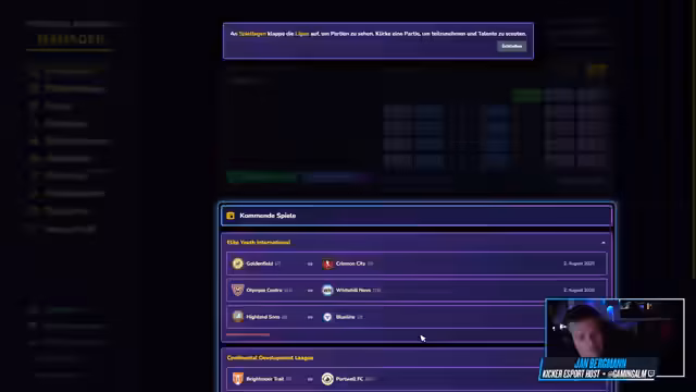 00:04:25Der Stream begrüßt die Zuschauer bei Kicker eSport und stellt die heutige Let's Play Folge vor. Thematisiert wird der Fokus auf Fußballspiele, speziell auf Titel mit geringen bis keinen Kosten. Das Hauptspiel des ersten Teils ist Sega Football Club Champions, ein Free-to-Play-Titel, der sich vom bekannten Sega Football Manager unterscheidet. Der Streamer kündigt für den kommenden Donnerstag ein Special mit der virtuellen Bundesliga an, um auf die finale Club Championship einzugehen. Der Einstieg in das Tutorial des Spiels gestaltet sich jedoch etwas unübersichtlich und textlastig.