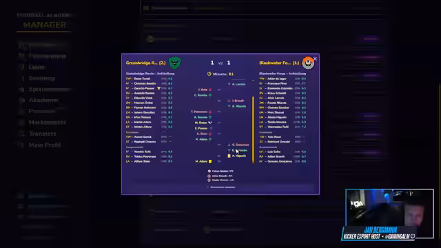 01:04:43Die Analyse des ersten Spiels zwischen Steine mit Geld und Alternate beginnt. Wichtige Tore, wie das von Duque in der 76. Minute, werden im Spiel-Feed nur durch den Ton bemerkt, nicht visuell. Dies wird als erster potenzieller Kritikpunkt am Darstellungsmodus identifiziert. Spieler wie Otis Jansen als Spieler des Spiels werden auf die Beobachtungsliste gesetzt. Das Scouting-System wird getestet: Spieler ohne spezielle Vorauswahl erhalten einen 1%-Scouting-Bonus, während gezielte Beobachtungen wie bei Kalisto Caruso den Fortschritt auf 18% bringen. Es wird festgehalten, dass mehrere Spiele benötigt werden, um ein umfassendes Spielerprofil zu erstellen.