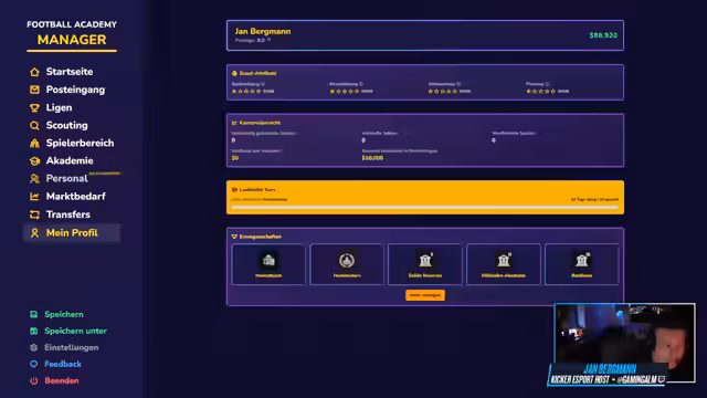 01:11:15Die eigene Rolle als Scout und dessen Entwicklung steht im Mittelpunkt. Durch Entdecken und Verpflichten von Talenten steigt das eigene Prestige. Attribute des Scouts verbessern die Effektivität des Scoutings. Kurse können zur Weiterentwicklung absolviert werden, wie ein 'Beobachtungskurs', der den Scouting-Fortschritt pro Spiel erhöht. Die Akademie wird als Kern des Spielers managements beschrieben. Die Personalplanung zeigt einen Countdown von 59 Tagen zur vollen Funktionsfähigkeit. Sponsoring und die ersten Marktanfragen von Vereinen für passende Talente deuten auf die Wirtschaftlichkeit des Managements hin.