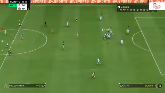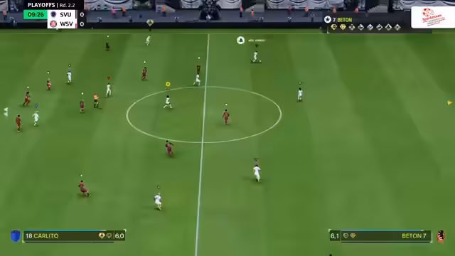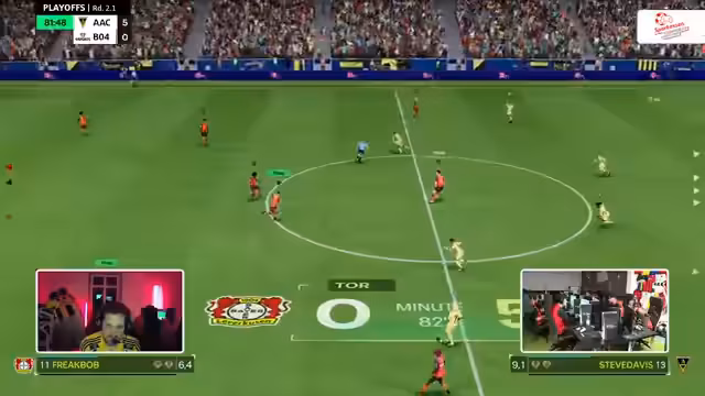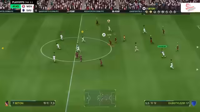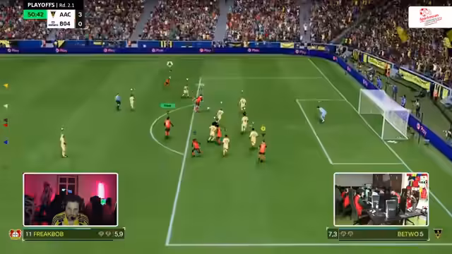 00:48:14Die ersten Playoff-Spiele beginnen, wobei Union Felbert auf den TSV Nord trifft. Das Spiel startet verhalten, mit beidseitigem Abtasten. Ein frühes Tor für B04 im Parallelspiel gegen Thura Polhausen (1:0 in der zweiten Minute) wird durch einen technischen Bug bei Polhausen unterbrochen, was eine Neuausrichtung der Mannschaften erfordert. Dies gibt Gelegenheit, die Unterschiede zwischen 1-gegen-1- und Pro-Clubs-Situationen aus Spieler- und Kommentatorensicht zu beleuchten. Pro Clubs bietet einen direkteren Bezug zu den Spielern, da man die realen Personen kommentiert und eine individuelle Statistik verfolgen kann, was eine tiefere emotionale Bindung ermöglicht. Im Gegensatz dazu konzentriert sich das 1-gegen-1-Kommentieren auf die Spielfiguren. Beide Modi bieten eine hohe Emotionalität, wobei Pro Clubs durch die Teamdynamik eine größere Lautstärke und Intensität erreicht. Die Partie zwischen Union Felbert und TSV Nord läuft nun live, wobei Felbert in den blauen Trikots und Norf in den hellen Trikots spielt.