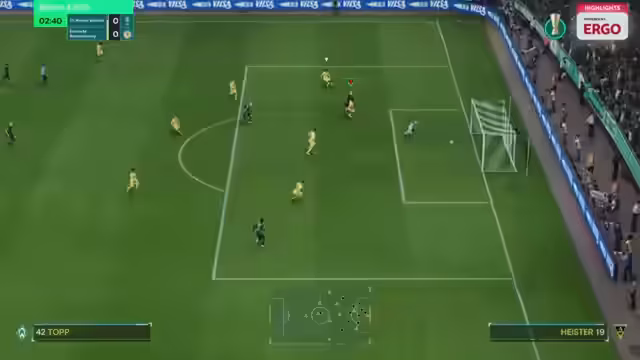 04:34:58Das Spiel beginnt mit einem Anstoß von Werder Bremen. Henning von Werder erzielt in der 6. Minute das 1:0 und legt nur fünf Minuten später auf 2:0 nach. Er zeigt von Beginn an eine konzentrierte und aggressive Leistung. Thaddeus von Braunschweig hat Schwierigkeiten, ins Spiel zu finden und gerät schnell in Rückstand. Kommentatoren loben Henings Leistung, der durch frühere Tore den Druck auf den Gegner aufbaut. Braunschweig wirkt zu Beginn überfordert und kann dem starken Auftritt von Bremen kaum etwas entgegenstellen.