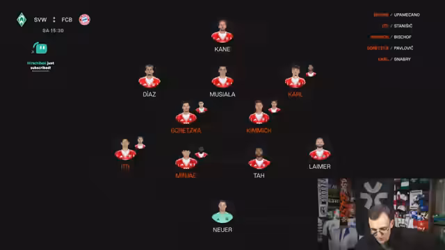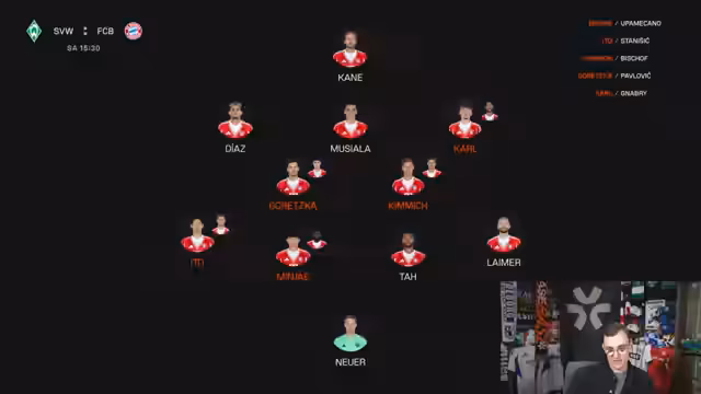 00:40:42Das Highlight-Spiel der Bayern gegen Bremen steht im Fokus. Kimmich hat nach dem Training eine 75-prozentige Startchance, bei Ausfall würde Bischoff und nicht Pavlovic in die Startelf rücken. Goretzka sieht er ebenfalls mit 65-prozentiger Wahrscheinlichkeit. In der Defensive ist Upamecanos Einsatz fraglich, was Amiri interessanter macht. Offensiv sind Kane und Musiala gesetzt, während Gnabry eine gute Chance hat, seine leichte Formkrise zu überwinden. Bangulas Startelf-Einsatz bleibt trotz seines offensiven Talents ein Rätsel, das Trainer Tuchel zu lösen scheint.