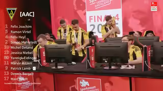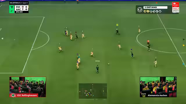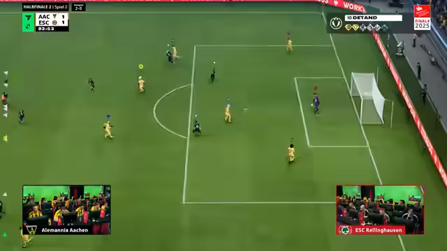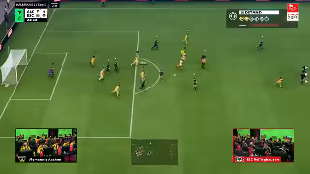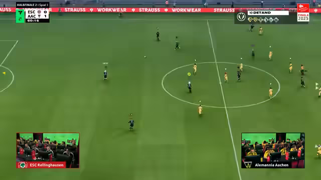 02:09:13Das Rückspiel des Halbfinales der Sparkassen Verbandsliga Rheinland beginnt. Alemannia Aachen, in gelben Trikots, führt nach dem Hinspiel mit 2:0 gegen den ESC Rellinghausen, der in schwarzen Trikots spielt. Trotz des Rückstands wird Rellinghausen zugetraut, das Spiel noch zu drehen, da im EFC 26 ein Zwei-Tore-Rückstand als überwindbar gilt. Kurz nach Anpfiff hat Rellinghausen einen Pfostentreffer, gefolgt von einem weiteren Pfostentreffer für Aachen. In der 10. Minute erzielt Aachen das 1:0 im Rückspiel durch einen Finesse-Schuss von Bergelt, was die Gesamtführung auf 3:0 erhöht. Alemannia Aachen, als Titelverteidiger und mit einer beeindruckenden Historie im E-Sport, zeigt sich weiterhin stark.