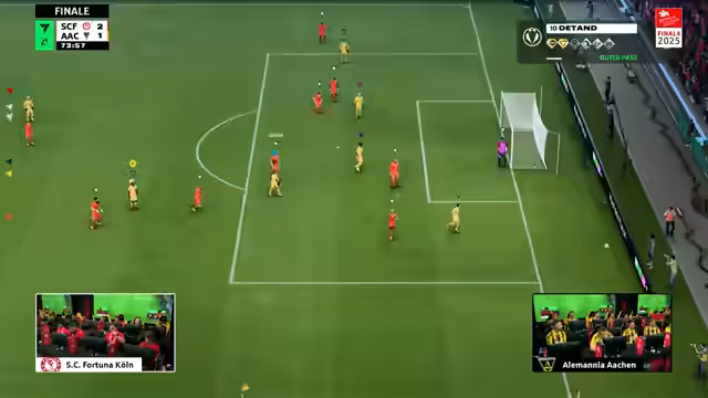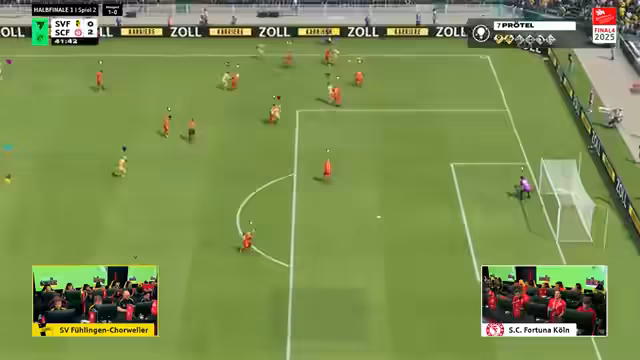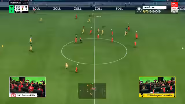 00:45:38Nach den letzten Vorbereitungen der Teams und der Einführung durch die Kommentatoren begann das erste Halbfinalspiel um 16 Uhr. SC Fortuna Köln, in roten Trikots, trat gegen SV Fühlingen-Chorweiler, in gelben Trikots, an. Für Fortuna Köln war es das erste Mal auf dieser großen Bühne, während Fühlingen-Chorweiler bereits Erfahrung aus dem Vorjahr mitbrachte. Die Anfangsphase des Spiels war geprägt von Ballbesitzphasen und dem Abtasten der Teams, um sich an die ungewohnte Umgebung zu gewöhnen. Es wurde betont, dass die Spieler sich an die neuen Mechaniken von EA FC 26 anpassen mussten, die seit den Game Days eingeführt wurden. Fühlingen-Chorweiler zeigte sich mit Feuer aus den Playoffs und kam mit viel Motivation ins Spiel. Die erste gefährliche Aktion hatte Fortuna Köln per Kopfball, der jedoch am Tor vorbeiging. Beide Teams agierten noch verhalten, um den Gegner abzutasten und nicht alles auf einmal preiszugeben. Die Zuschauer im Chat wurden aufgefordert, ihre Favoriten zu nennen.