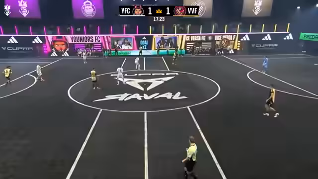 01:17:02Beide Teams agieren vorsichtig in der Double-Goal-Phase, ohne viel Risiko einzugehen, was zu einem 1-1-Unentschieden führt. Vice Versa präsentiert eine starke Defensive, während Juniors durch offensive Akzente versucht, das Spiel zu kontrollieren. Der Trash Talk zwischen den Teams bleibt auf einem sportlichen Niveau, mit Younes der seine Mannschaft motiviert. Das Spiel bleibt trotz der geringen Torausbeute spannend, da beide Teams auf Fehler warten.