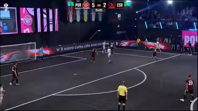 01:15:59Trotz der taktischen Ausrichtung gibt es auf beiden Seiten weiterhin Torchancen, wobei die Porcinos in den letzten Minuten der ersten Halbzeit einen leichten Aufwind erleben. Die Atmosphäre in der ausverkauften Cupra Arena in Barcelona wird durch die Gesänge der Porcinos-Fans, eine Adaption von 'Sara Perquetiamo', beschrieben. Eine herausragende Aktion von Laxier und eine Parade von Dani Perez werden als Höhepunkte genannt. Die Kommentatoren diskutieren über Giovane Ken, den Bruder des bekannten Spielers Mois Ken, der in der Kings Cup Conference in Italien auf sich aufmerksam gemacht hat. Mois Ken selbst war kürzlich in Deutschland viral gegangen, unter anderem durch Stefan Fugert auf RTL. Kurz vor der Halbzeitpause kommt es zu Tonproblemen im Stream, die im Chat thematisiert werden. Die Kommentatoren reagieren darauf und klären, dass der vermutete Verursacher, Andres, heute nicht anwesend ist. Die erste Hälfte endet mit einer 3:1-Führung für die Porcinos. Die Kommentatoren bewerten die Halbzeit als sehr eng, wobei die Topstars bisher nicht den erwarteten großen Einfluss hatten, da sich die Mannschaften gegenseitig gut neutralisiert haben.