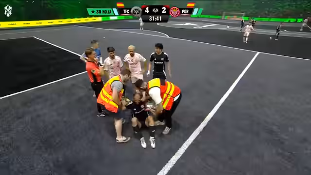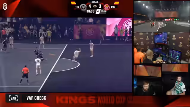 02:30:58Das Spiel ist völlig offen. Eine Verletzung bei den Tronkos führt zu einer Spielunterbrechung und einer VAR-Prüfung, bei der ein möglicher Strafstoß abgelehnt wird. Die Porsinos nutzen den Schwung, um durch Gilles Vidal auf 1:2 zu verkürzen. Durch eine Fortnite Secret Card (Double Goal) wird das Spielstand dynamisiert: Jedes Tor zählt doppelt. Die Porsinos gleichen innerhalb weniger Sekunden aus und durchlaufen die enorme emotionale Achterbahnfahrt eines möglichen Sieges.