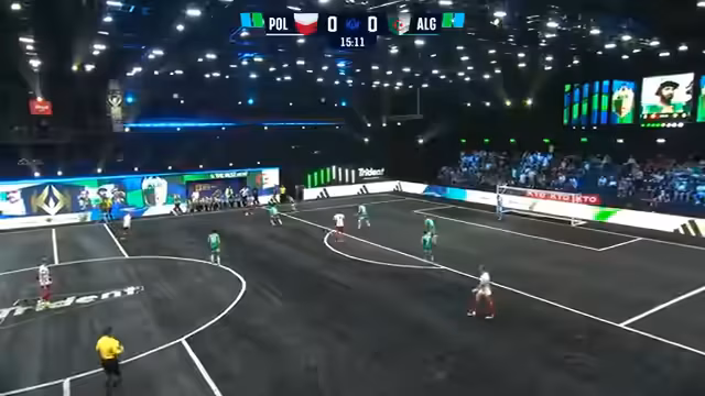 02:41:05Die Partie nimmt Fahrt auf, als Algerien im Double-Goal-Modus, in dem jedes Tor doppelt zählt, mit 0:2 in Führung geht. Der polnische Torhüter Patrick Zappala verletzt sich dabei, woraufhin ein Torwechsel nötig wird. Polen gleicht durch Norbert Jaszczak kurz darauf aus, was die Spannung in das Spiel zurückbringt. Die besonderen Regeln des Formats werden wiederholt erklärt und erläutert.