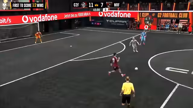 02:11:53Zur Halbzeitpause im Spiel zwischen G2 und No Rules kommt es zu einer Verletzungspause, als Anthony Manouba bei einem Zusammenstoß verletzt wird. Die Behandlung dauert einige Minuten, was beide Teams unterbricht. In der Pause dominiert G2 das Spiel und geht mit 4-2 in Führung. No Rules hat sichtlich Probleme, ins Spiel zu finden, während G2 kämpferisch und eingespielt wirkt.