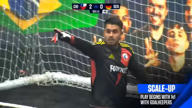 01:28:22Chile hat ihren Starplayer, Nacho Herrera, aktiviert. Dieser erzielt kurz darauf ein Tor, welches dank seiner Binde doppelt zählt. Chile führt mit 5:2. Durch den Treffer ist der Starplayer für Chile beendet. Das Spiel geht mit 5:2 für Chile in die Pause. Kommentator Andres appelliert an die deutsche Mannschaft, ruhiger und cleverer zu spielen, und man erinnert an die starke zweite Halbzeit im Spiel gegen die USA. Für die zweite Halbte wird ein Modus angekündigt, bei dem alle Tore doppelt zählen.