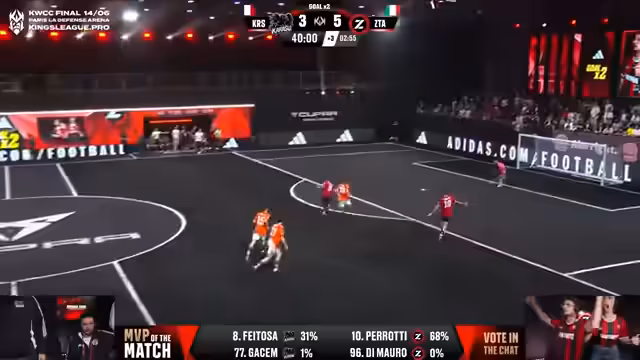 01:32:47Im nächsten Duell stehen sich die Franzosen von Carasso und die Italiener von FC Seta gegenüber, beide ehemalige Vizemeister. Das Spiel ist von Anfang an umkämpft und auf Augenhöhe. Besonders auffällig ist das Duell zwischen den Starstürmern Matteo Perotti von Seta und Gaccim von Carasso. Das Spiel endet 5:4 für Seta nach einem dramatischen Finish mit Wechselfehlen und gelben Karten. Seta zielt damit ins Achtelfinale.