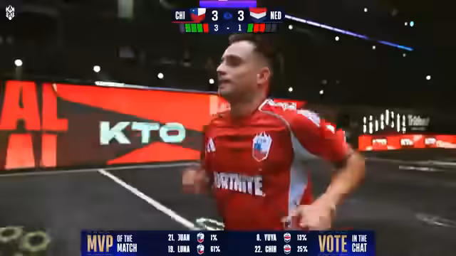 04:12:32Nach regulärer Spielzeit steht es 2:1 für Chile. Anschließend beginnt der Double-Ball-Gall-Modus, eine Phase, in der beide Teams defensiver agieren. Währenddessen wird über die von den Teams gezogenen Karten spekuliert. Niederlande zieht als Erster und erhält den Joker, Chile zieht nach und wählt den Penalty. Das Spiel endet nach 36 Minuten mit einem 3:3 nach dem Traumtor von Mohamed Chi.