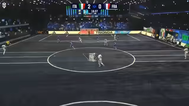 01:34:58Das Eröffnungsspiel beginnt mit dem 1-1-Duell Alessandro Colombo gegen Vittorio Gili im Escalador-Modus. In diesem Modus steigt die Spieleranzahl kontinuierlich an. Italien geht durch einen starken Schuss von Torwart Vittorio Gili in Führung. Das Tor wird nach VAR-Prüfung wegen knapper Abseitsstellung aberkannt. Kurz darauf schießt Matteo Perotti im Starplayer-Modus für Italien, das Tor wird gezählt. Auch Frankreich antwortet mit einem Treffer. Die Partie ist von körperlicher Härte geprägt. Beide Teams verlieren durch gelbe Karten wichtige Spieler.