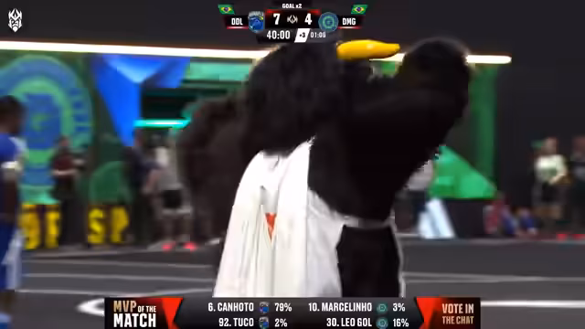 02:37:30Nach der spanischen Partie beginnt das große brasilianische Derby zwischen Dendele und den Desimpedidos. Beide Teams legen von Beginn an ein hohes Tempo vor. Der neue Wildcard-Spieler Luis Alves für die Desimpedidos ist direkt erfolgreich und erzielt gleich das erste Tor. Das Spiel ist von Anfang an offen und von vielen Chancen geprägt.