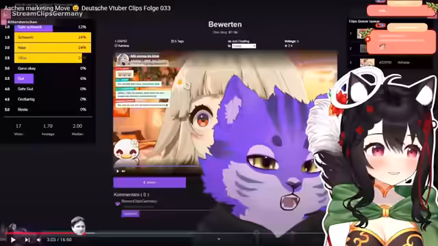01:26:21Nachdem die Suche nach dem perfekten Handytierchen abgebrochen wurde, beginnt der Stream um 19:38 Uhr einen neuen Reaction-Stream für VTuber-Clips aus Deutschland. Unmittelbar danach wechselt das Thema zu Baumstriezel, einer speziellen Gebäckart. Der Streamer beschreibt verschiedene Zubereitungsarten, Füllungen und deckt dabei den Unterschied zwischen veganen und klassischen, oft frittierten Varianten auf. Diese detaillierte Beschreibung führt zu einer Diskussion über die Verfügbarkeit und die norddeutsche Spezialität.