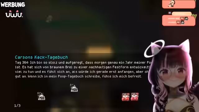 01:40:10Eine auffällige Wiederholung im Stream ist das Thema des 'Kack-Tagebuchs', das der Streamer durchliest. Dieses Tagebuch scheint die Gedanken eines Charakters zu dokumentieren, der von seinen Verdauungserlebnissen und gleichzeitig von düsteren Ereignissen wie dem Verschwinden von Menschen und brutalen Morden berichtet. Diese Einträge verstärken die unheimliche Atmosphäre des Streams.