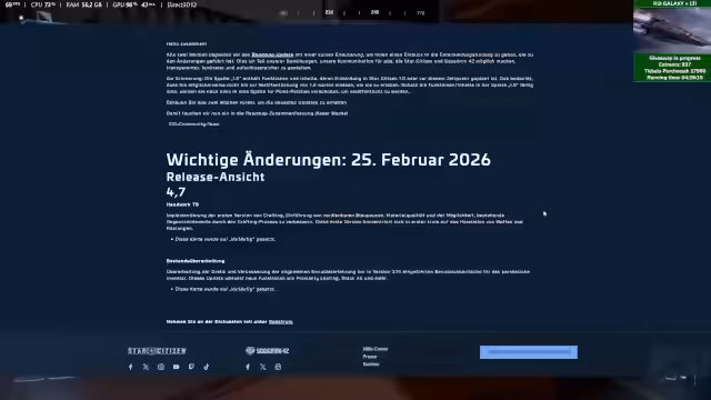 Es wurde eine Zusammenfassung der Entwicklungspläne für Star Citizen vorgestellt. Der Fokus lag auf dem Gameplay in der aktuellen Alpha 4.6 und einem Ausblick auf die bevorstehende Version 4.7. Zudem wurde ein Giveaway für ein RSI-Galaxy-Schiff mit Lebenslanger Versicherungsanwartschaft veranstaltet.