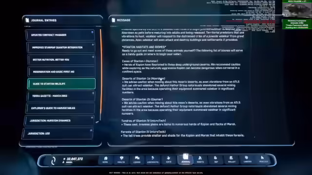 02:27:49Der Streamer beginnt im leeren Spaceport und erkundet einen leeren Hangar. Er berichtet über Bugs und hohe Desync-Probleme, die das Spiel beeinträchtigen. Beim Versuch, eine Rüstung anzuziehen und eine Kriminalitätsstrafe zu begleichen, stellt er fest, dass dies nicht möglich ist, und vermutet einen Bug, da andere Spieler ihre Rüstung ebenfalls verloren haben. Auch die Home-Location ist fehlerhaft und bringt ihn an falsche Orte.
