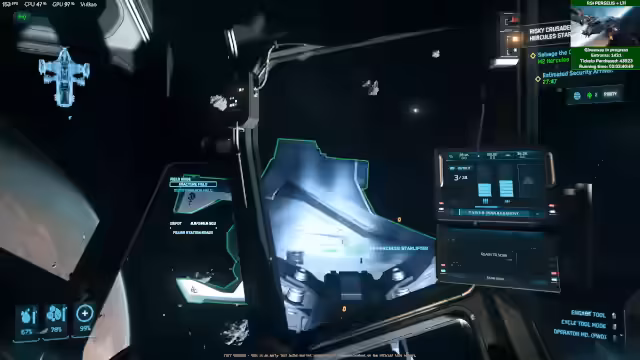 00:31:37Ein Hauptaugenmerk des Streams liegt auf dem Test der Reclaimer. Nachdem das Andocken an Raumstationen endlich möglich ist, wird dies live im Spiel demonstriert. Dabei zeigt sich, dass das Andocken zwar funktioniert, aber noch verbuggt ist und die Reclaimer manchmal nur hinein 'glitscht'. Das automatische Entladen an Raffinerien ist noch nicht implementiert, und das Storen des Schiffes am Dockingport funktioniert ebenfalls noch nicht fehlerfrei.