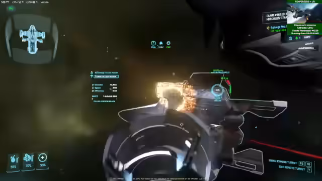 03:39:14Das Stream-Team ist mit dem salvagenden Schiff, einer Reclaimer, im Einsatz. Es wird das Problem diskutiert, dass die Reclaimer nach einem Relog in Area 18 als Heavy Fighter und nicht als Schiff mit Hangar spawnen kann. Dies erschwert das Abholen von Fracht. Man beschäftigt sich mit der Mechanik, Kisten einzusammeln und mit der Idris zu transportieren, was als umständlich und undurchdacht empfunden wird.
