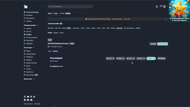01:54:21Fünf exklusive Coin-Gewinner werden gezogen: FlytomTV, Renegade, White Dragon, Netcode und Black Tech Lars. Die Gewinner müssen auf Twitch eine Nachricht mit dem Stichwort 'Coin' senden, um ihren Code und Link zum Einlösen zu erhalten. Der Coin ist weiterhin käuflich erhältlich; der Link wird im Chat geteilt. Der Stream betont, dass Support 'kein Mord' ist. Parallel wird die letzte Chance für Tickets beim Galaxy-Giveaway genutzt.