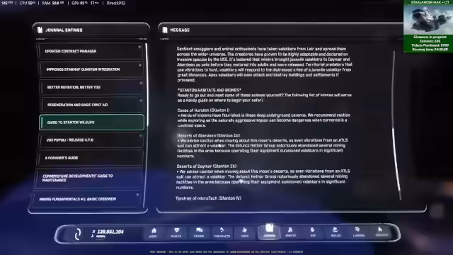 00:55:45Nach Ankündigung eines neuen potenziellen PTU-Builds mit persistenten Blaupausen und Vendul-Besuchen auf der Rockbreaker-Lokation, wechselt der Streamer ins Spiel. Gemeinsam mit Zuschauern wie Bitkiller und Crazy plant er, eine Mission zu testen. Dazu soll eine Polaris als Basis dienen, während eine Gole und eine Mole für Bergbau und Kampf zum Einsatz kommen. Gleichzeitig wird der Zustand des PTU-Updates beobachtet, wie z.B. die Performance und das Verhalten der neuen Elemente.
