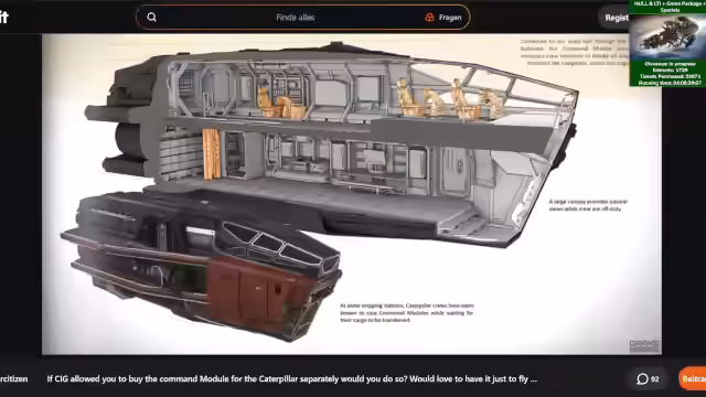 03:23:43Der Stream konzentriert sich auf die neue Ironclad und deren Command-Modul. Dieses Modul kann von der Ironclad oder Caterpillar abgedockt werden und ist ein vollwertiges kleines Schiff mit Quantum Drive, Jump Drive und Waffensystemen. Der Übergang zwischen Haupt- und Modul erfolgt nahtlos, dauert etwa zwei bis drei Sekunden. Aktuell ist das Modul jedoch noch nicht vollständig spielbar, insbesondere kann der Pilotensitz nicht genutzt werden.