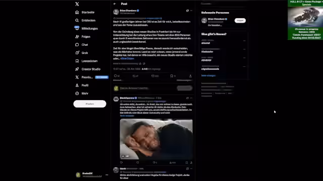 05:03:21Der Streamer berichtet über die überraschende Nachricht, dass Brian Chambers, leitender Entwickler bei Cloud Imperium Games und maßgeblich an Squadron 42 beteiligt, das Unternehmen verlassen hat. Der Streamer analysiert verschiedene Möglichkeiten für diesen Schritt, einschließlich persönlicher Gründe wie des Todes des Bruders von Brian, der im März 2024 stattfand. Er diskutiert auch über mögliche berufliche Gründe und die ungewöhnliche Situation, dass ein leitender Entwickler kurz vor dem Release eines Projekts das Unternehmen verlässt. Der Streamer betont, dass es vorerst keine offizielle Stellungnahme von CIG dazu gibt und dass es Spekulationen nur schwer zu beurteilen sind.