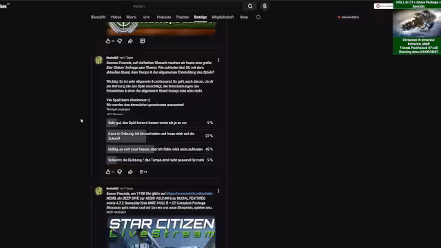 01:12:43Die Ergebnisse einer Umfrage zur Star Citizen Entwicklung wurden präsentiert. Im Discord zeigten 14% sehr positive Bewertungen, 48% waren zufrieden mit zukünftigen Erwartungen, 33% bewerteten als mäßig und 5% negativ. Auf YouTube waren die Bewertungen kritischer mit nur 9% sehr positiv, 37% zufrieden, 45% mäßig und 9% negativ. Der Streamer interpretiert dies als insgesamt positiv-optimistisches Stimmungsbild.