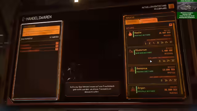 06:02:55Die Frage nach effektiven Handelsstrategien mit der Taurus wird beantwortet: Fracht kann entweder über den Aufzug in das Stationsinventar gebracht und dort verkauft werden, oder das Schiff kann mit im Cargo-Grid gesicherter Fracht gestored und dann über das Trading-Terminal verkauft werden. Die Einnahmen aus der geplünderten Polaris belaufen sich auf 382.500, was als 'ziemlich gut' für Schrott bewertet wird, obwohl es die Kosten für die abgeschossenen Torpedos nicht deckt. Es wird ein weiteres Experiment vorgeschlagen: mit der Polaris nach Pyro zum Sandwurm zu fliegen und diesen mit einem Torpedo zu besiegen.
