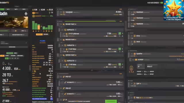 02:40:06Der Streamer testet die Paladin in der 4.5 PTU im Vergleich zum Live-Server. Nach einem Kilometer Abstand wird frontal auf das Schild gefeuert. Der Test zeigt eine deutlich längere Time-to-Kill: Im PTU hält die Paladin über vier Minuten durch, während sie auf Live nach drei Minuten explodiert. Das entspricht einer 50% längeren Überlebensdauer. Kritik gibt es jedoch an massiven Nerfs der Schilde, deren HP von 63.000 auf 45.000 sanken und deren Resistenzen reduziert wurden, was Laserwaffen zusätzlich stark begünstigt. Dies führt zu einer Diskussion über PvP- vs. PvE-Komponenten und die Notwendigkeit von Ausgleichsmechanismen.